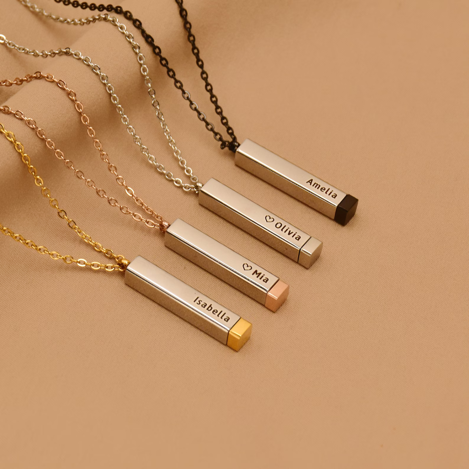 Our Retractable 3D Bar Necklace is more than a piece of jewelry—it’s a hidden message, a surprise memory, a discreet reminder of someone special. Slide open the bar to reveal a personalized engraving inside—whether it’s a name, quote, date, or short message, it stays tucked away just for you (or someone you love).